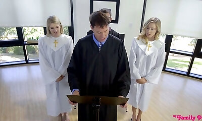 Sinful babe Haley Reed heads wild on a hard pole in front of priest