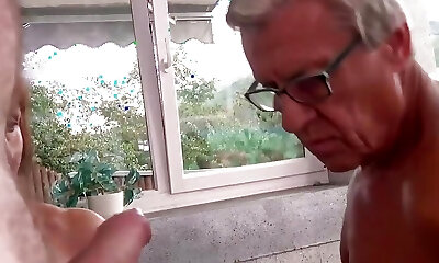 Mature wife Oksana drops on her knees for two stiff jism guns