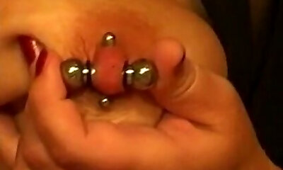 nippleringlover - horny cougar masturbating, heavy weights pulling extremely pierced nipples